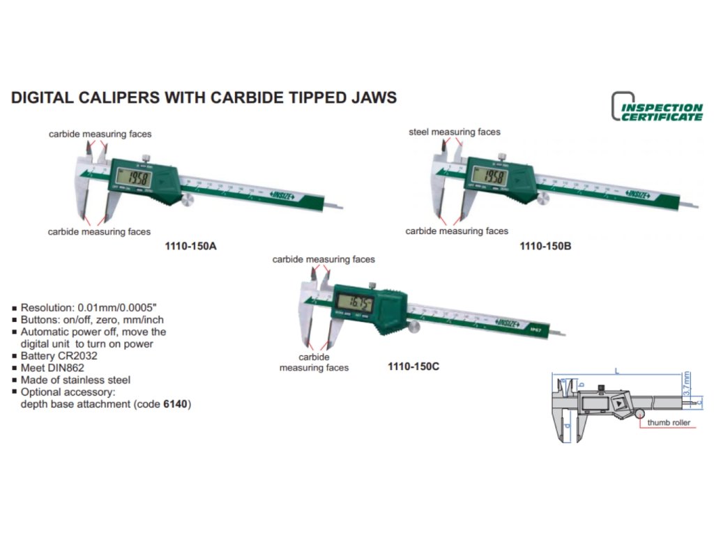 Digitální posuvné měřítko s karbidovými doteky od INSIZE. Na výběr je 12 variant s rozsahem měření 0-150 mm, 0-200 mm a 0-300 mm s nebo bez posuvového kolečka. Má výstup dat a plochý hloubkoměr.
