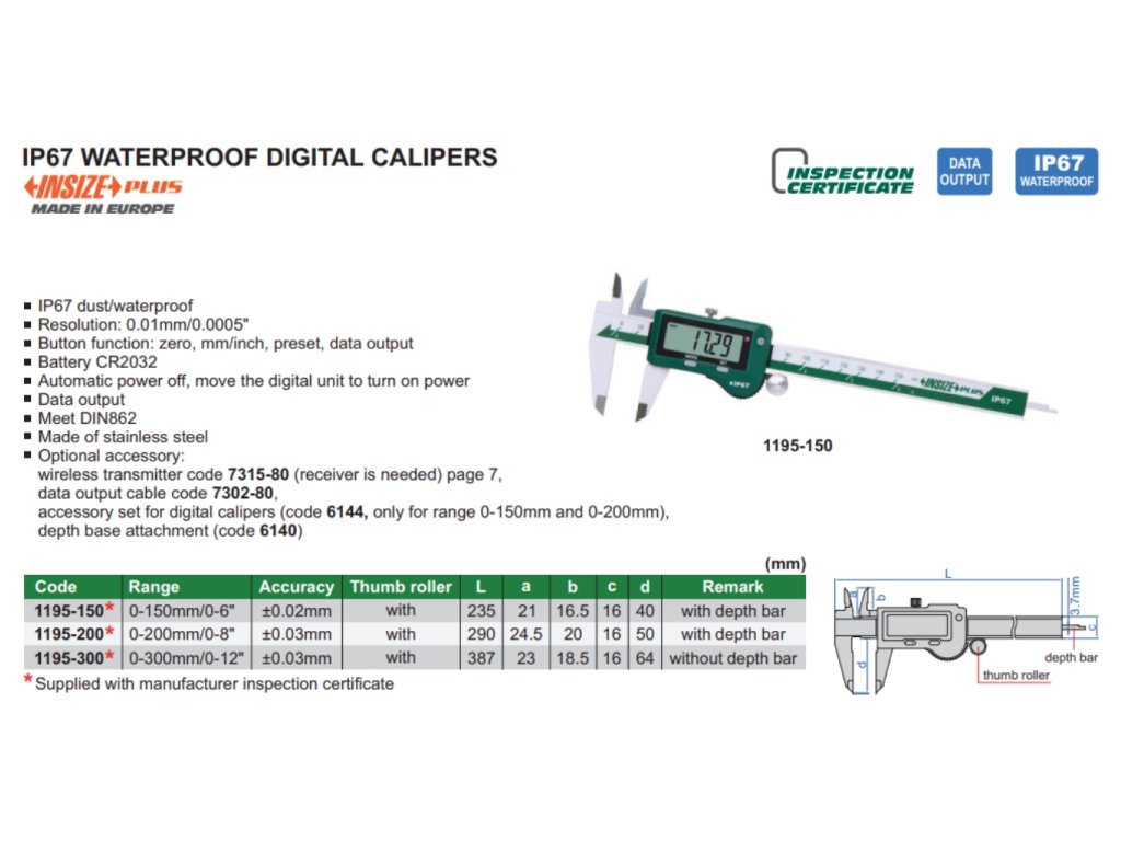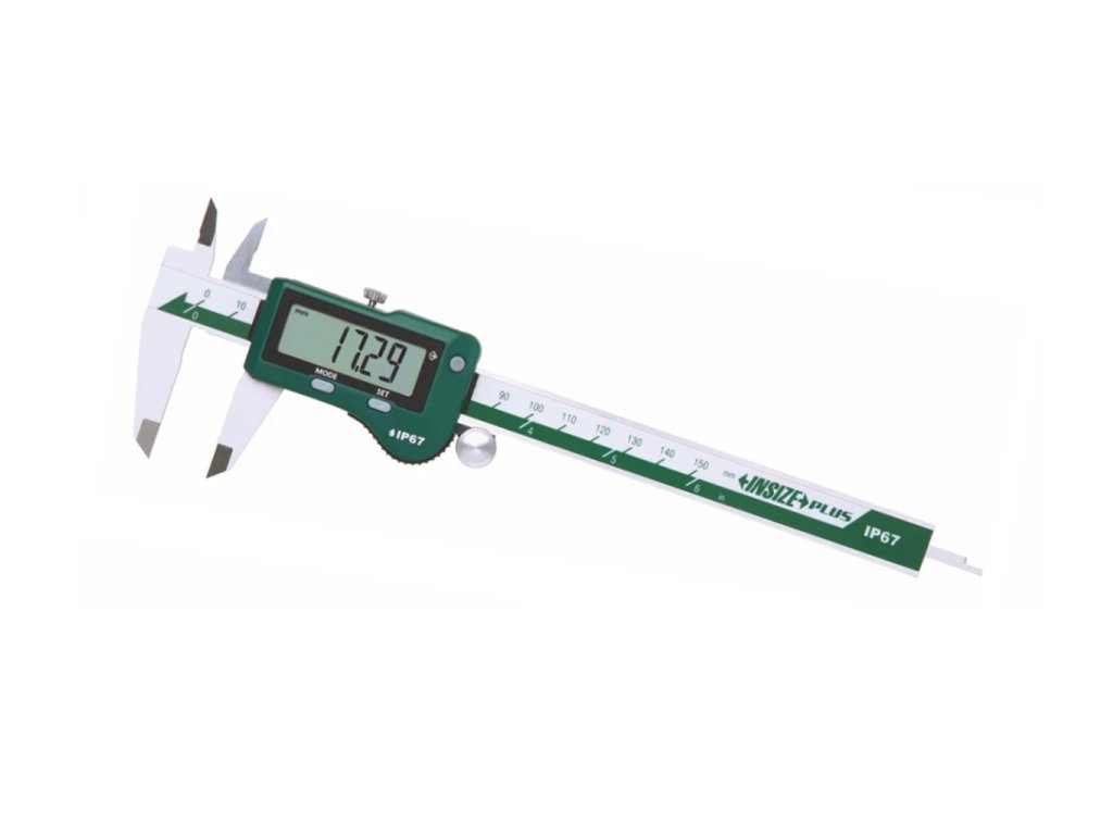 Digitální posuvné měřítko s ochranou IP67 od INSIZE PLUS. Na výběr jsou 3 varianty s rozsahem měření 0-150 mm, 0-200 mm a 0-300 mm s posuvovým kolečkem. Je s nebo bez plochého hloubkoměru.