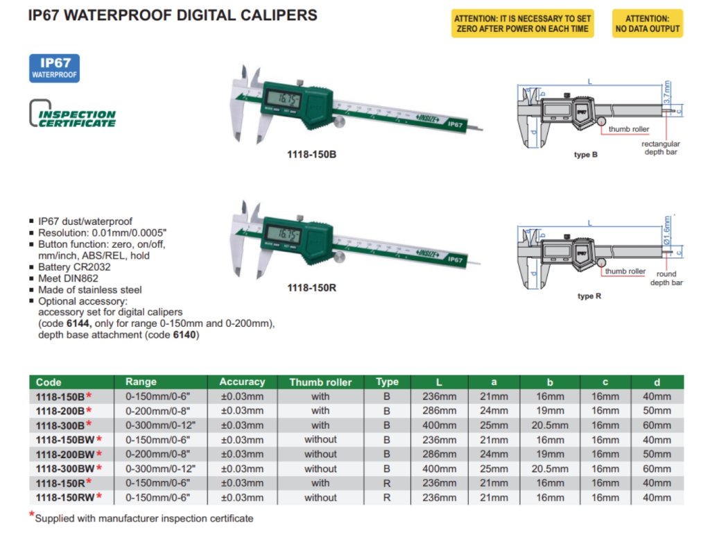 Digitální posuvné měřítko s ochranou IP67 od INSIZE. Na výběr je 8 variant s rozsahem měření 0-150 mm, 0-200 mm a 0-300 mm s nebo bez posuvového kolečka. Má plochý nebo kulatý hloubkoměr.