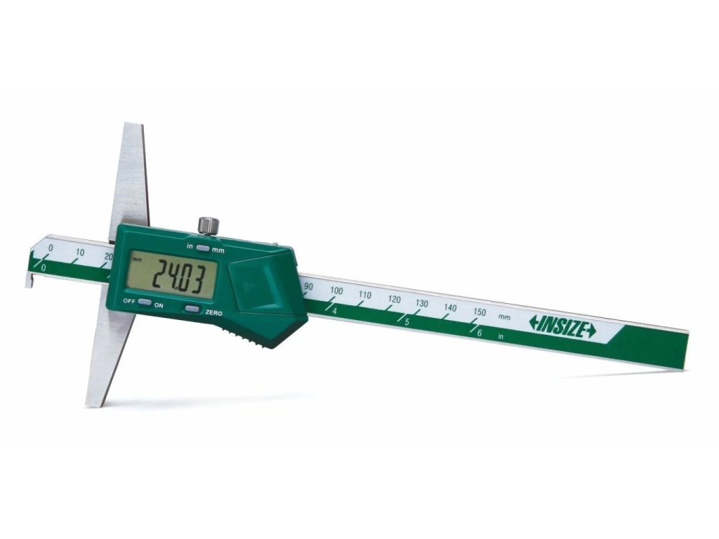 Digitální hloubkoměr s nosem značky INSIZE o rozsahu měření 0- 150 mm/0-6″, s přesností měření+/- 0,03 mm a datovým výstupem.