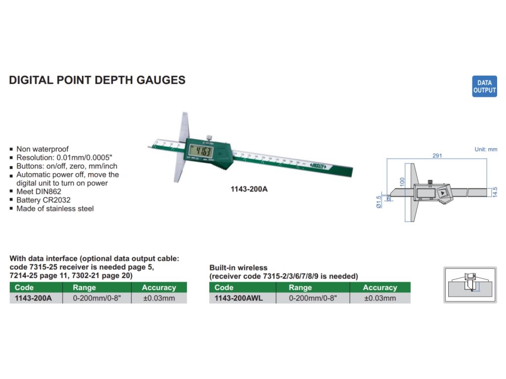 Digitální hloubkoměr s předním dotekem od značky INSIZE, rozsahem měření 0-200 mm/0-8″, výstupem dat a automatickým vypnutím měřidla .