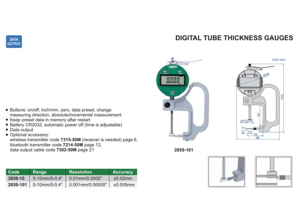 | 2859-101 | 0-10 mm / 0-0,4" | 0,001 mm / 0,00005" | ±5 µm | 5.7.2 |