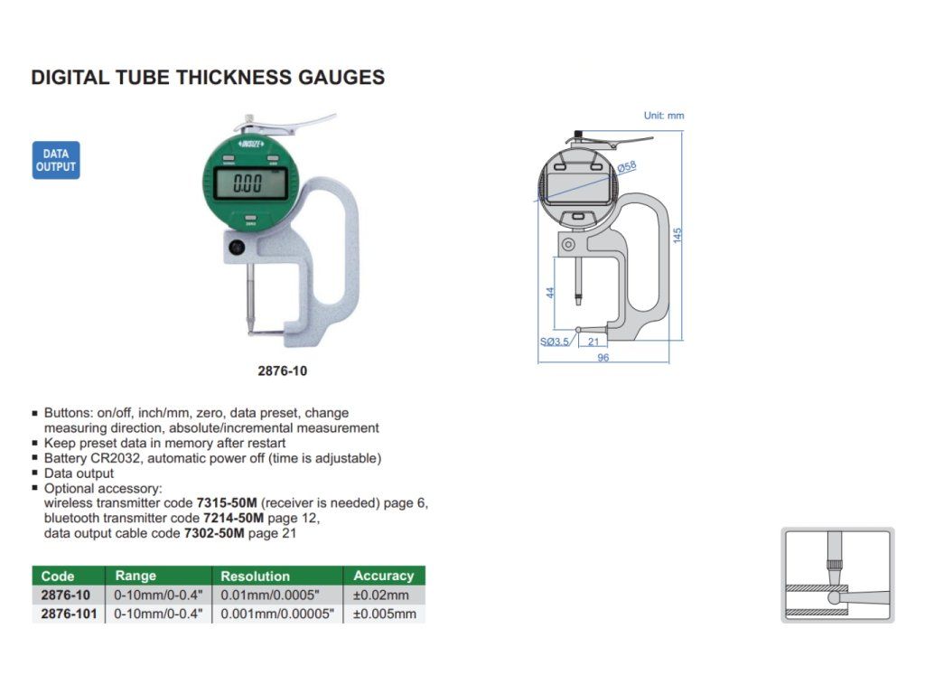Digitální tloušťkoměr pro měření trubek od INSIZE. Na výběr jsou 2 varianty s rozsahem měření 10 mm a výstupem dat.