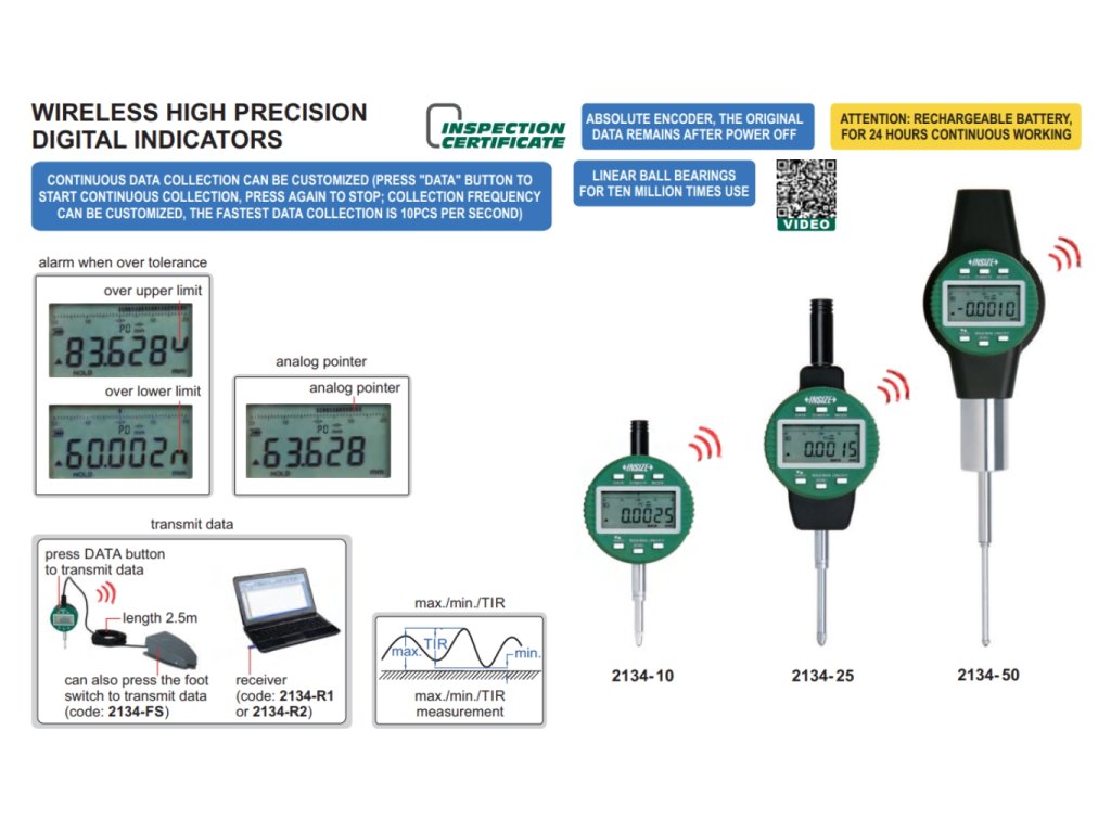 Digitální úchylkoměr s integrovaným bezdrátovým výstupem dat pomocí Zigbee signálu od INSIZE. Na výběr je 7 variant s rozsahem měření 12,7 mm, 25,4 mm a 50,8 mm.