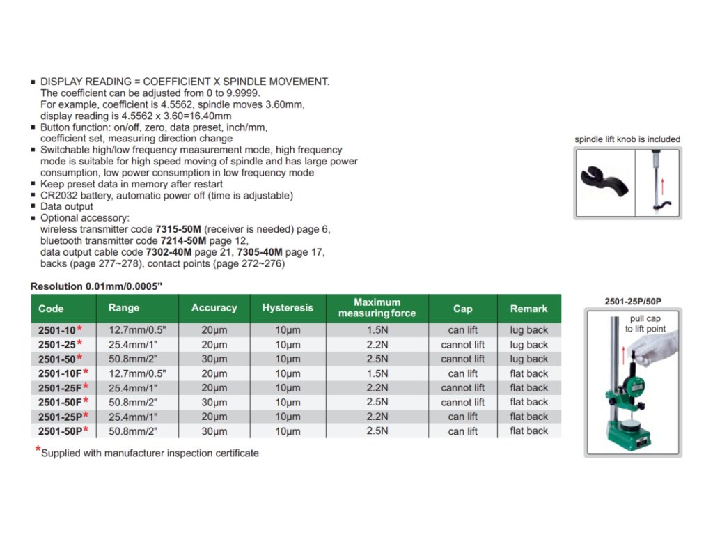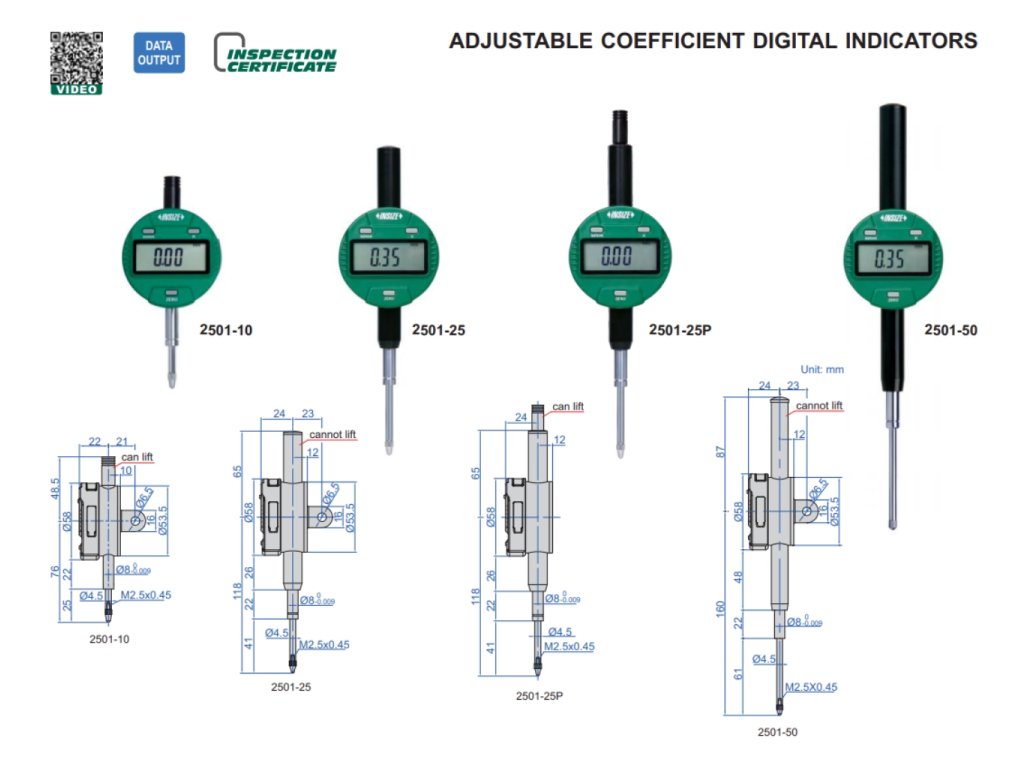 Digitální úchylkoměr s nastavitelným koeficientem od INSIZE. Na výběr je 8 variant s rozsahem měření 12,7 mm, 25,4 mm a 50,8 mm. Má výstup dat.