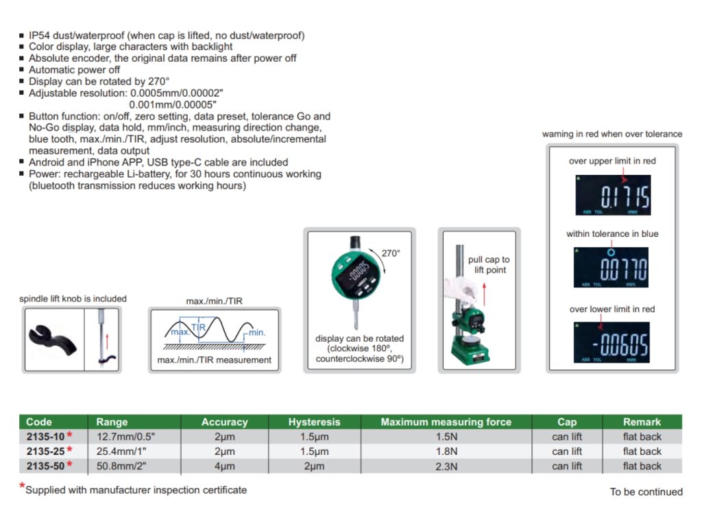 Digitální úchylkoměr s integrovaným Bluetooth od INSIZE. Na výběr jsou 3 varianty s rozsahem měření 12,7 mm, 25,4 mm a 50,8 mm.