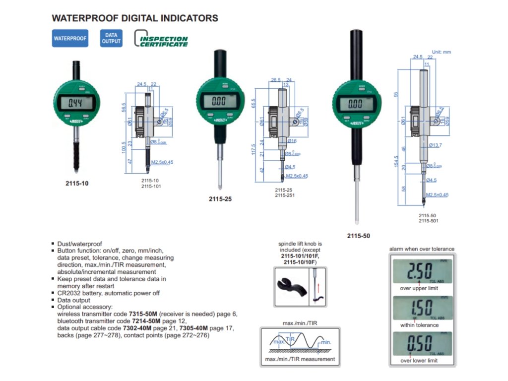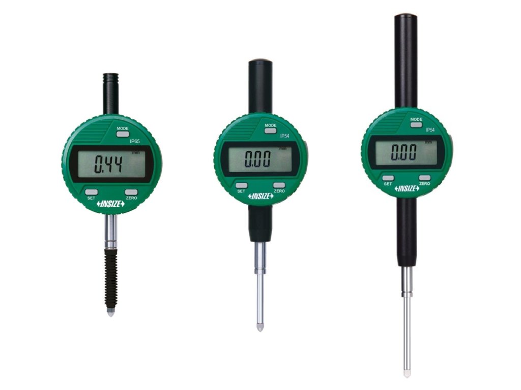 Digitální úchylkoměr voděodolný s ochranou IP54 nebo IP65 od INSIZE. Na výběr je 12 variant s rozsahem měření 12,7 mm, 25,4 mm a 50,8 mm. Má výstup dat.