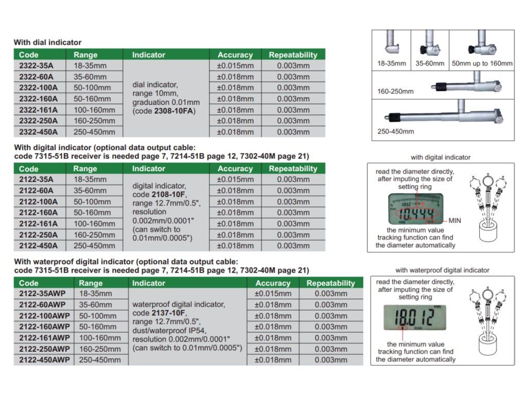 Dutinoměr s číselníkovým úchylkoměrem nejprodávanější od INSIZE. Na výběr je 7 variant s rozsahem měření 18-35 mm, 35-60 mm, 50-100 mm, 50-160 mm, 100-160 mm, 160-250 mm a 250-450 mm.