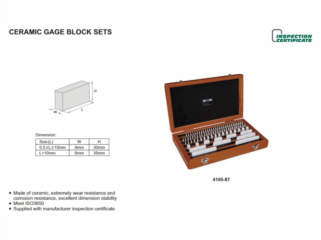Sada obsahuje Johansonovy keramické měrky (koncové měrky) s rozsahem od 1,001 do 100 mm značky INSIZE - 46 ks třídy 0.