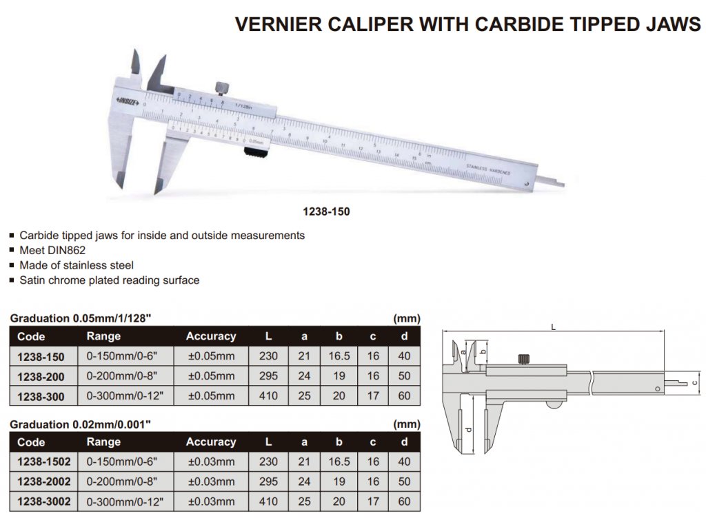 Posuvné měřítko značky INSIZE s doteky z tvrdokovu, rozsahem měření 0-300 mm/0-12″, dělením 0.05/1/128″.