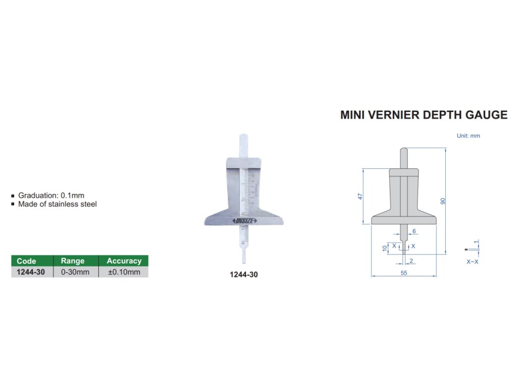 Mechanický hloubkoměr mini od INSIZE. Na výběr je 1 varianta s rozsahem měření 0-30 mm.