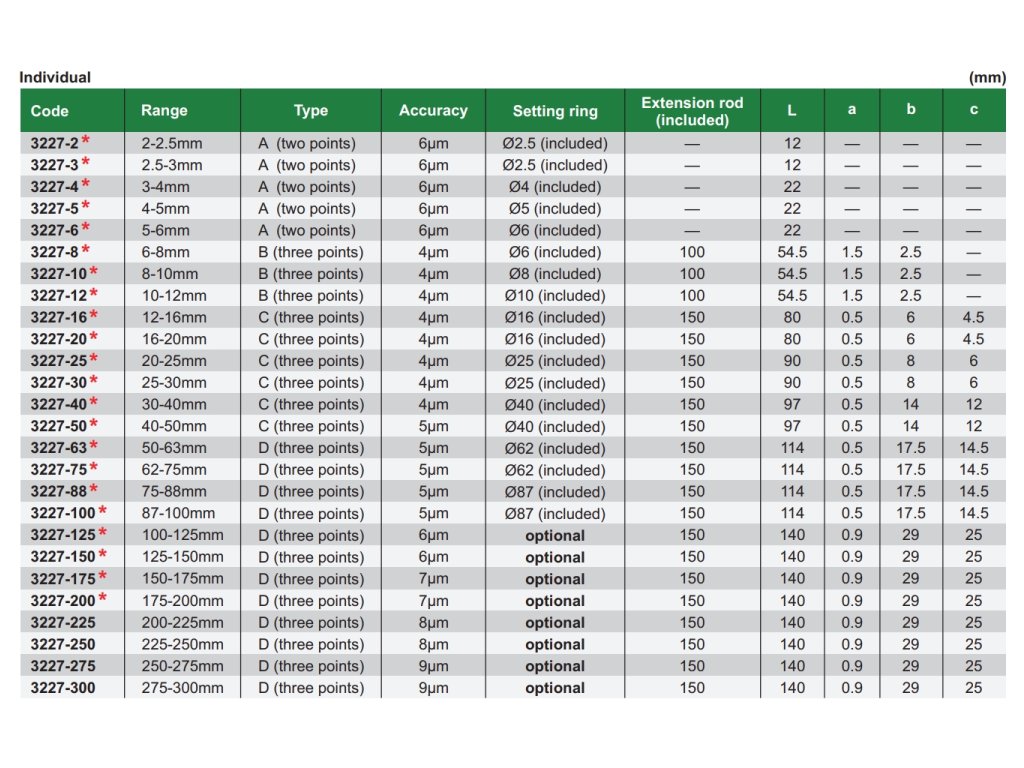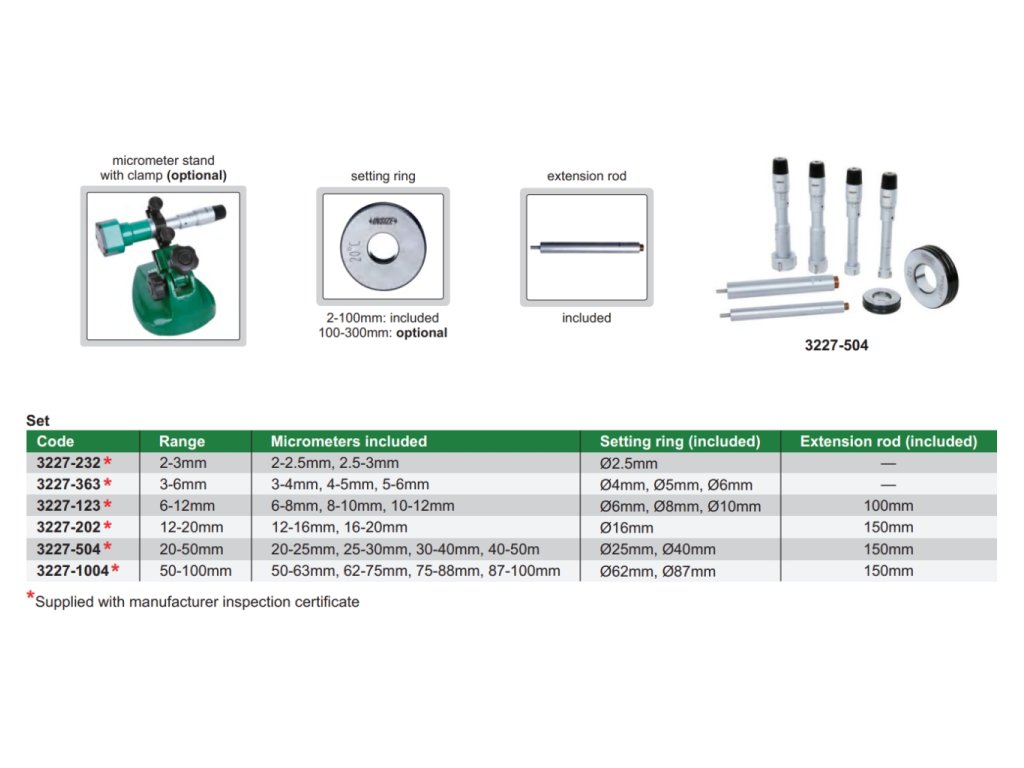Sada tří třídotekových dutinoměrů s rozsahy měření 6-12 mm a s rozlišením 0,001 mm od značky INSIZE. S nastavovacími kroužky o ø 6,8 a 10 mm a prodlužovacím nástavcem v délce 100 mm.
