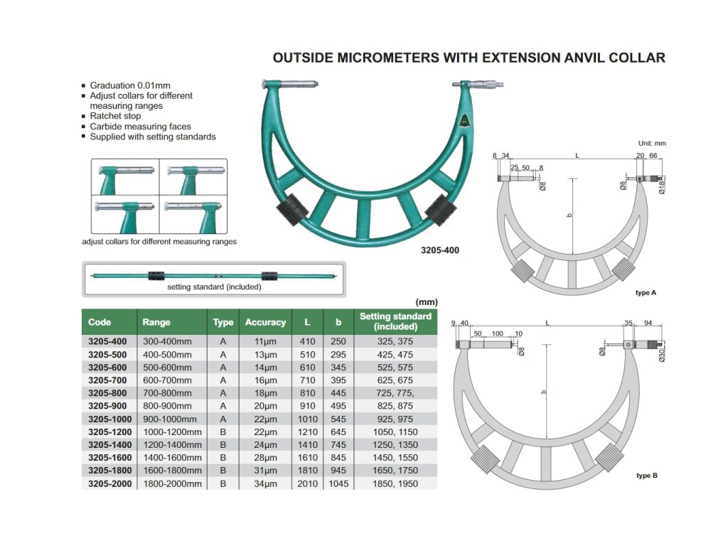 Mechanický mikrometr 700-800/0,01 mm s prodlouženou měřicí plochou, typ A INSIZE