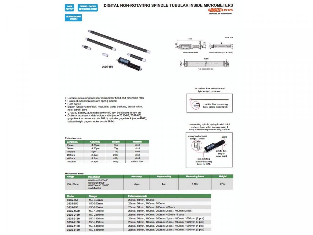 Digitální mikrometrický odpich od značky INSIZE s rozsahem měření 150-1550 mm. S nerotujícím třmenem a mikrometrickou hlavicí 150-180 mm. Výstup dat.