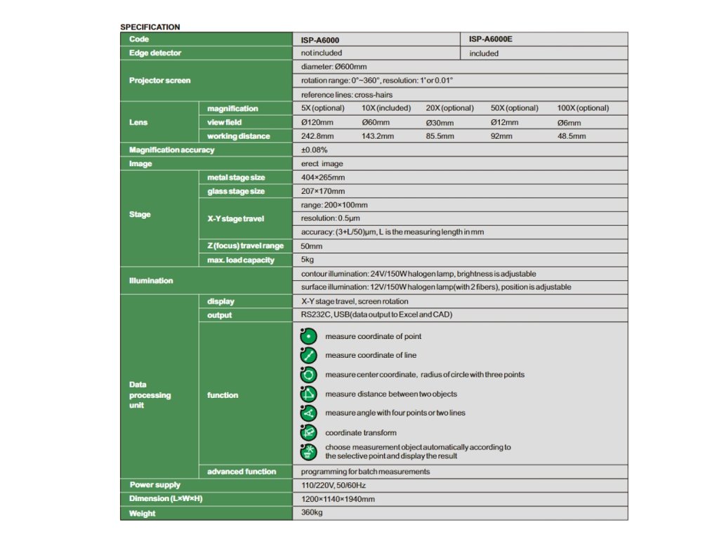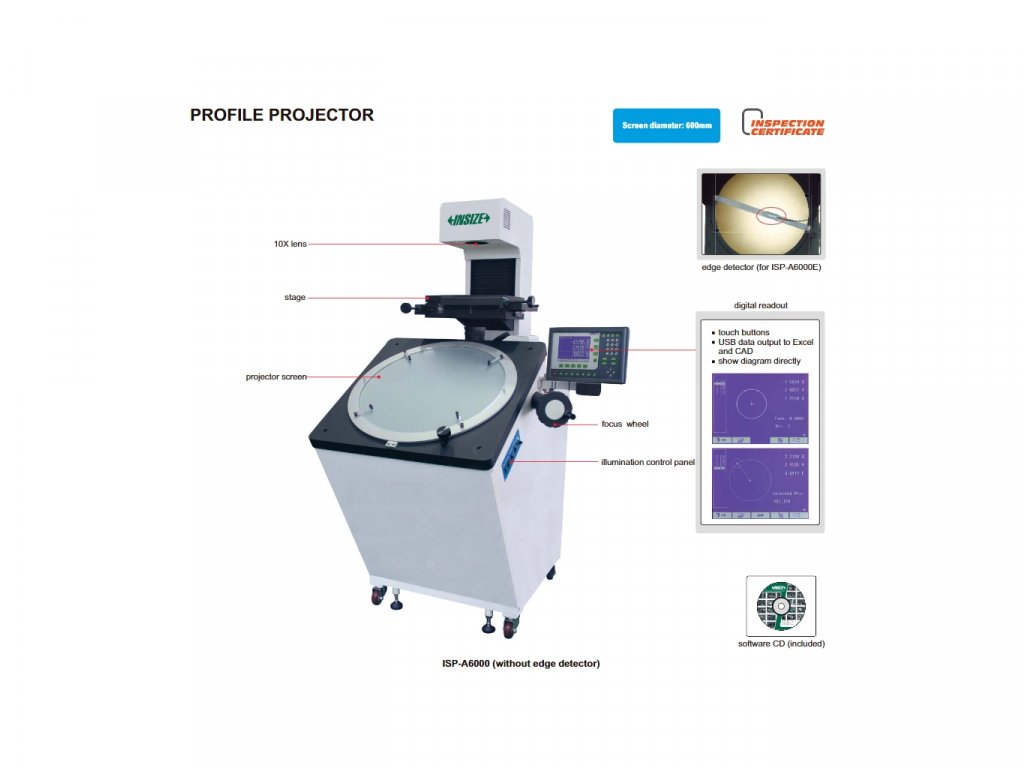 Profilprojektor ISP-A6000 od INSIZE s 10X zvětšením o přesnosti ±0,08 %. Průměr skleněné matnice je 600 mm a je otočná o 360°. S možností výstupu dat přes RS232C a USB.