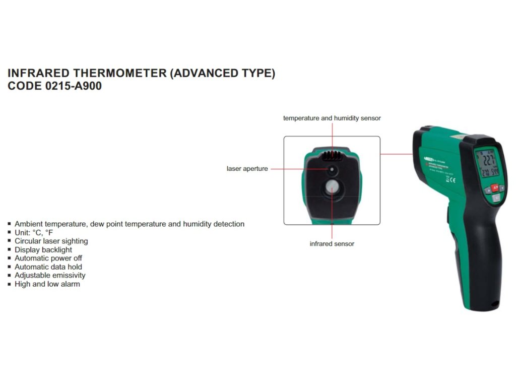 Infračervený teploměr s rozsahem -30°C ~ 800°C od INSIZE pro detekci okolní teploty, rosného bodu a vlhkosti. S kruhovým laserovým zaměřováním, podsvícený displej.