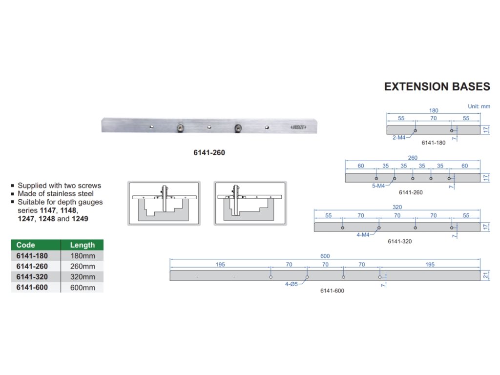 Prodlužovací základna pro hloubkoměry od INSIZE. Na výběr jsou 4 varianty s délkou 180 mm, 260 mm, 320 mm a 600 mm.
