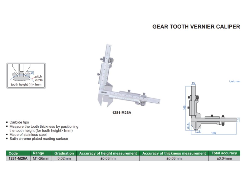 Mechanické (analogové) posuvné měřítko pro měření tloušťky ozubených kol od INSIZE. Na výběr je 1 varianta s rozsahem měření M1-26 mm.