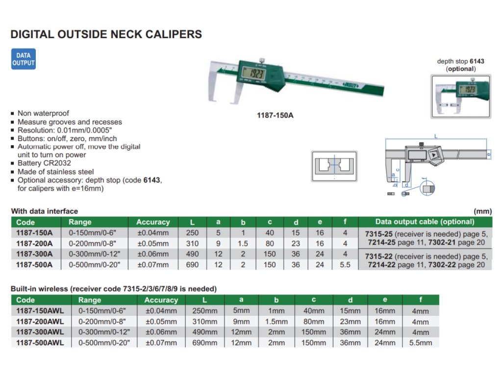 Digitální posuvné měřítko pro měření vnějších drážek od INSIZE. Na výběr je 8 variant s rozsahem měření 0-150 mm, 0-200 mm, 0-300 mm a 0-500 mm. Má výstup dat.