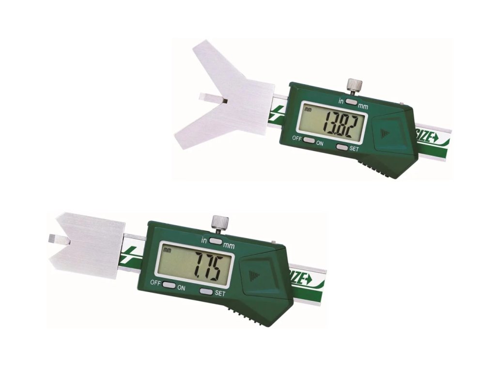 Digitální posuvné měřítko pro měření délky zkosení 45° od INSIZE. Na výběr jsou 2 varianty s rozsahem měření 0-8 mm a 0-20 mm. Má výstup dat.