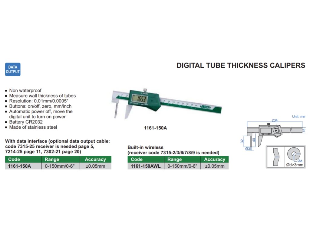Digitální posuvné měřítko s trubičkou o délce 32 mm a průměru 3 mm od INSIZE. Na výběr jsou 2 varianty s rozsahem měření 0-150 mm. Má výstup dat.