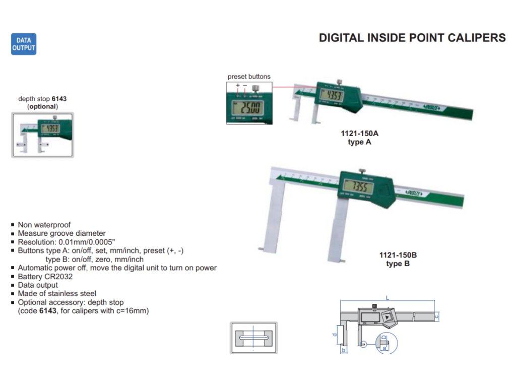 Digitální posuvné měřítko s vnitřními bodovými rameny od INSIZE. Na výběr je 18 variant s rozsahem měření 24-150 mm, 35-150 mm, 25-200 mm, 40-200 mm, 30-300 mm, 50-300 mm, 40-500 mm, 60-500 mm a 80-500 mm. Má výstup dat.