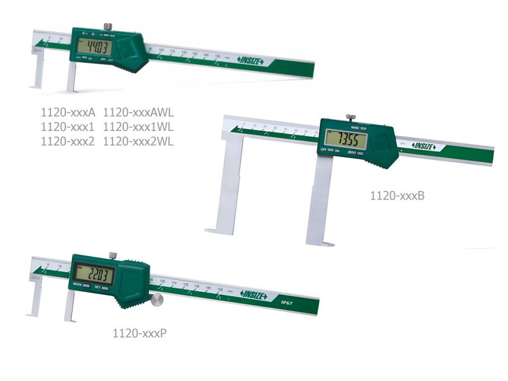 Digitální posuvné měřítko s vnitřními spodními rameny od INSIZE. Na výběr je 19 variant s rozsahem měření 22-150 mm, 35-150 mm, 25-200 mm, 40-200 mm, 30-300 mm, 50-300 mm, 40-500 mm, 60-500 mm a 80-500 mm. Má výstup dat.