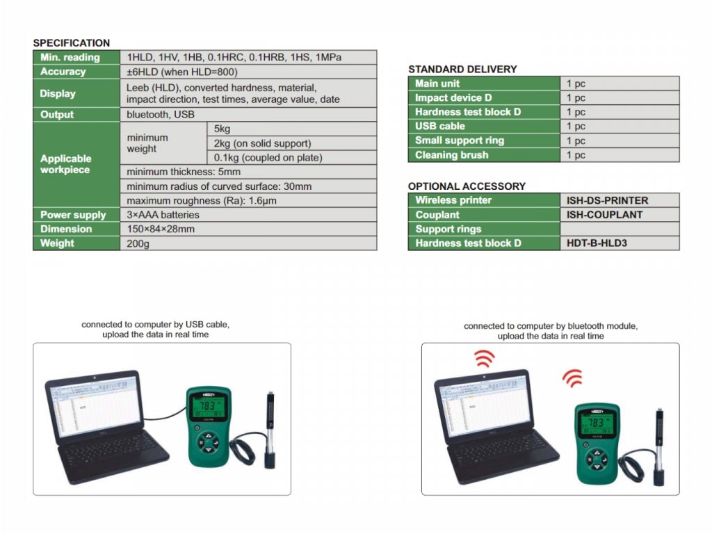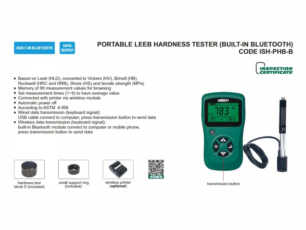 Tvrdoměr LEEB ISH-PHB-B s externí sondou od INSIZE s pamětí až na 99 záznamů, přesnost měření ±6 HLD. Možnost datového výstupu přes Bluetooth a USB.